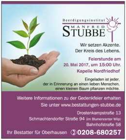 Hier ist endlich für Sie der Rückblick auf unsere allfrühjährliche Gedenkveranstaltung, die nun schon zum dritten Mal auf dem Nordfriedhof stattgefunden hat. Wir möchten uns nochmal herzlich bei allen Beteiligten, und vor Allem allen Teilnehmenden bedanken, die sich mit uns am 20. Mai 2017 in der Kapelle des Nordfriedhofes in Oberhausen eingefunden haben. Unter dem Leitgedanken „Der Kreis des Lebens“ fand eine liebevoll ausgestaltete Gedenkstunde, mit einem ökumenischen Gottesdienst statt, um dem ewigen Kreislauf des Werdens und Vergehens zu gedenken. Unser Dank geht an dieser Stelle ausdrücklich an Frau Cordula Stubbe-Ortmann, Gemeindereferent Berthold Rzymski und Frau Pfarrerin Wiebke Reinhold für ihre Beiträge zum ewigen Kreislauf des Lebens. Mittelpunkt war stets der Baum, der nicht nur Symbol für die Ewigkeit ist, er ist auch Sinnbild für unser Leben, denn bei näherer Betrachtung haben wir mehr gemein miteinander, als man zuerst vermuten mag. Auch ein Baum hat im Laufe seines Lebens mit vielen Widrigkeiten zu kämpfen, ob gegen Dürren, Sturm oder Krankheiten. Durch seine starken, tiefen Wurzeln gelingt es dem Baum aber, alle Widrigkeiten zu überstehen. Besonders Menschen, die um Jemanden trauern benötigen viel seelische Kraft, um die eigene Zukunft nicht heute, aber irgendwann, positiv gestalten zu können. Unter diesem Aspekt luden wir Sie im Anschluss an die Gedenkstunde ein, einen kleinen Baum in Erinnerung und als Symbol für die Kraft und das Leben zu pflanzen. Wir freuen uns schon jetzt auf das kommende Jahr. Bis Bald – Ihr Team vom Beerdigungsinstitut Stubbe